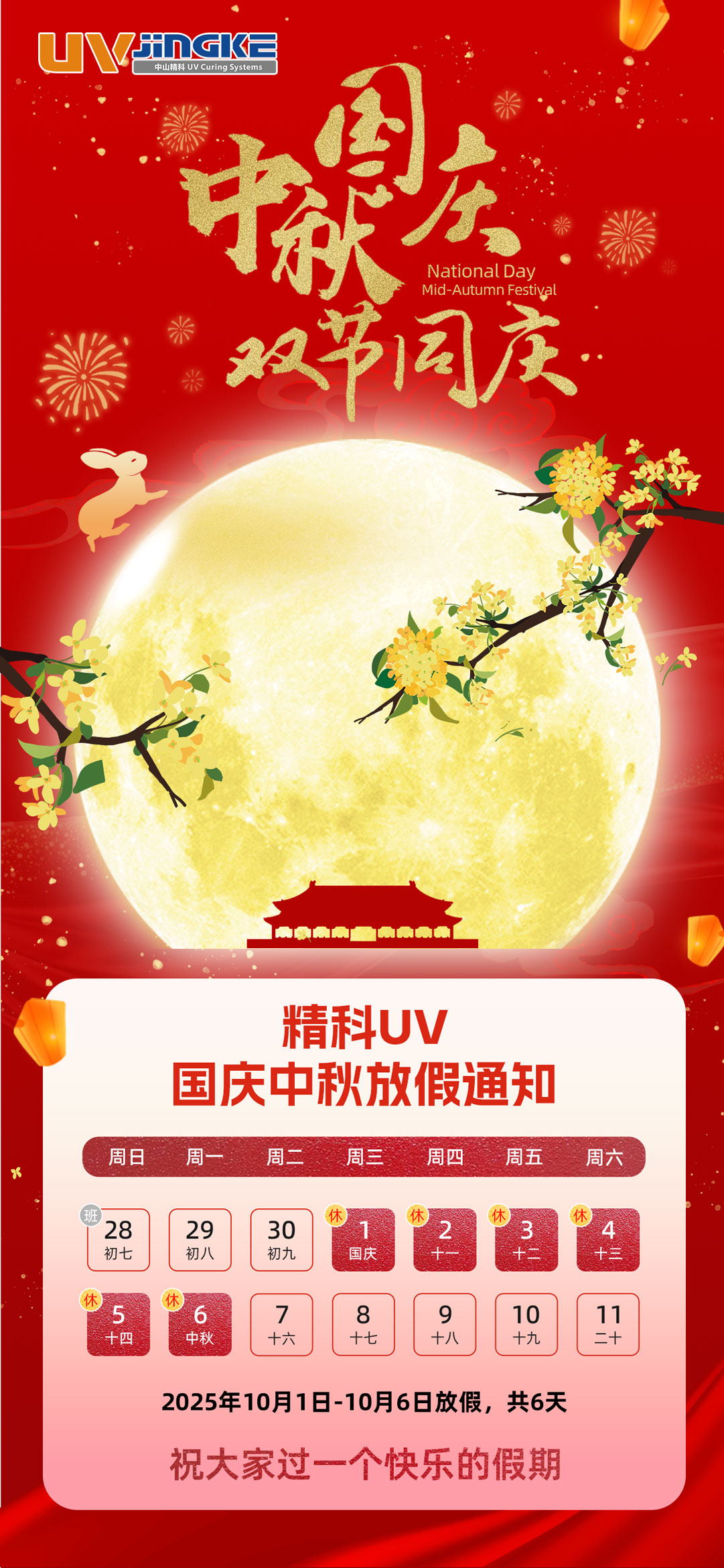 【精科UV】2025年国庆中秋放假通知及温馨提示 根据国务院办公厅关于2025年部分节假日安排的通知,今年国庆节恰逢中秋节,两个超棒的节日喜相逢,合并放假6天! 一、放假时间安排 放假安排:10月1日(星期三)至6日(星期一)放假调休,共6天。 补班安排:9月28日(星期日) 正常上班。 假期后正式上班时间: 10月7日(星期二)正式恢复上班。 二、温馨提示 秋高气爽,月圆人安。在这举国同庆、阖家团圆的美好时刻,中山市精科印刷设备有限公司预祝大家: 国庆快乐,中秋安康,阖家幸福,万事如意!