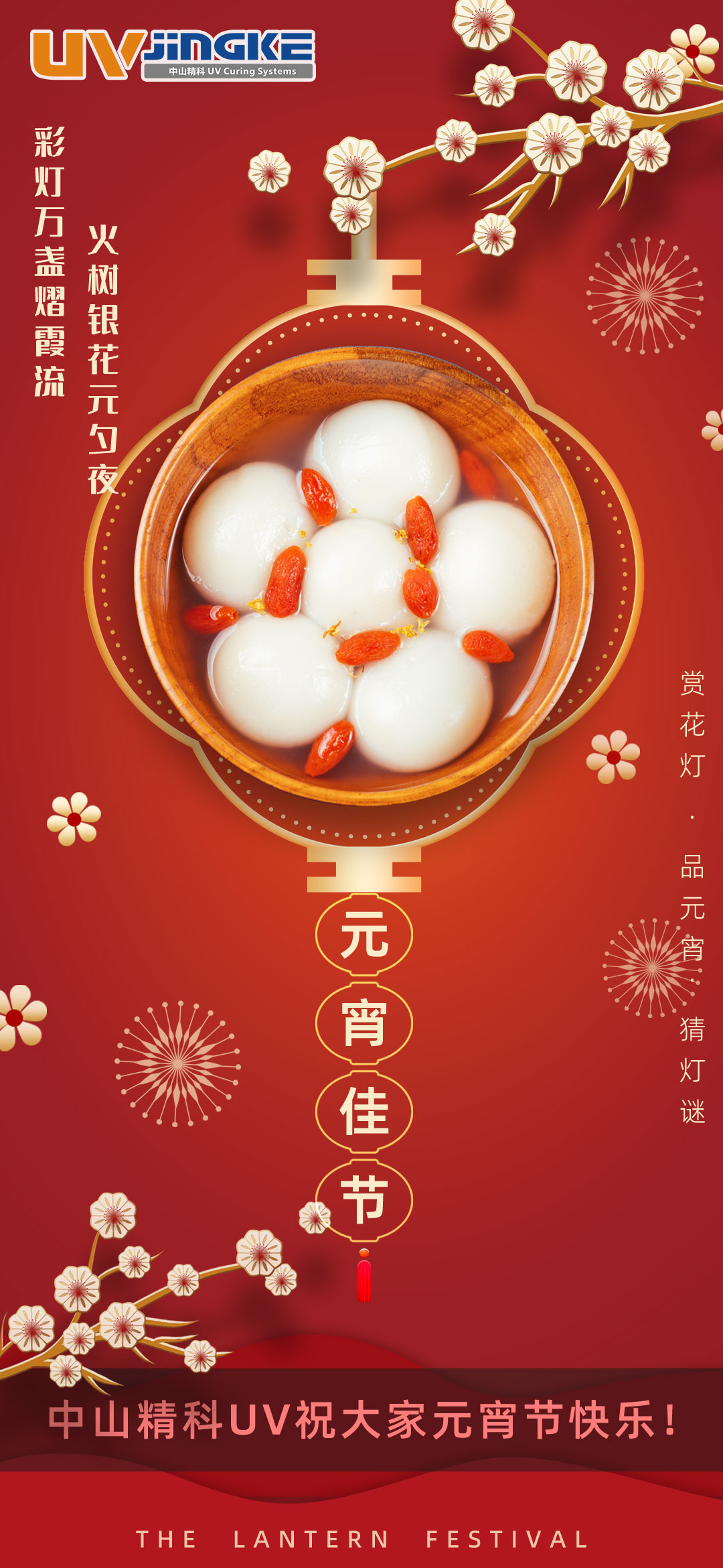闹元宵,庆团圆!中山精科UV送祝福啦! 尊敬的客户朋友: 灯火良宵,元宵纳福。值此佳节,中山精科UV向您致以诚挚问候! 上元圆满,新程再启。我们将继续以精工品质,为您提供优质UV解决方案。 祝您元宵快乐,阖家安康;生意璀璨,马到成功!